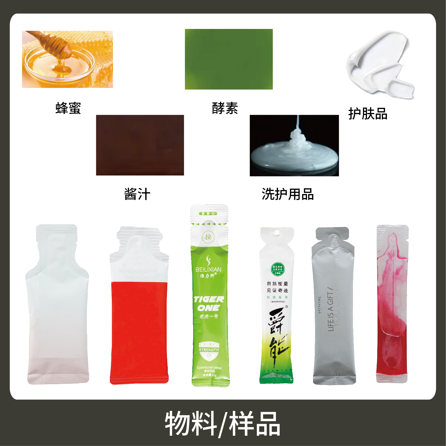 適用于各行業(yè)中酵素、果汁、漱口水、洗護用品、染發(fā)劑、化妝品小樣等醬料、液體物品的異形袋計量包裝。